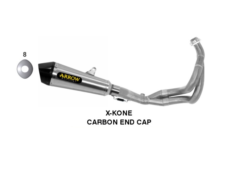 X-Kone X-Kone silencers were designed at first to be used in our Competition and Competition Full Titanium systems. The results ad appreciation these silencers got suggested to create a separate line of standard systems, using a new carbon endcap, designed to fit naked and sportbikes. The internal structure of the silencer is in stainless steel, silencer body is in Nichrom (an alloy with stainless steel) with satin finish: depending on the bike X-Kone silencers can be fitted on the original silencers (as a slip on – with an adaptor) and/or on the Arrow collectors (part of the full system) and they are secured to the frame by means of a mount welded on the upper side of the body. Noise damping is achieved by absorption: this enables to reduce the weight and the dimensions of the silencer: the weight of the silencer is about 2.2kg, typically 30/40% less than the OE. Even installing the slip on version only helps increasing performance, logically using the X-Kone silencer with Arrow collectors gives the best performance gain. Fitting an X-Kone is easy and fast and these systems do not require to change original settings of the ECU or to add a separate ECU module. Arrow suggests to check CO levels once the exhaust is installed. X-Kone silencers are street legal with removable baffle.