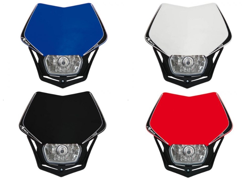 Koplamp van Racetech, model V-Face. Deze koplamp kan met vier rubber banden aan de vork worden bevestigd. Het bodywork van de koplamp is zwart. Het bovenste deel van de lamp is leverbaar in diverse kleuren.