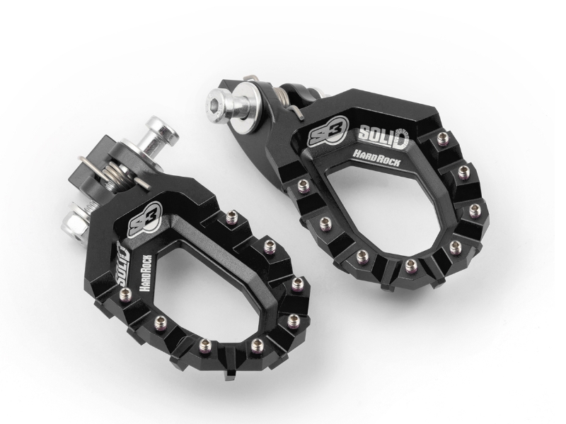 S3 Footpegs Trial Solid Hardrock Made from forged 7075 Ergal Aluminum! Low and Back model. Wider for better stability, lower to lower the center of gravity. The “V” shape prevents the footpegs from crashing into obstacles. Delivered as a kit. 5mm lower |