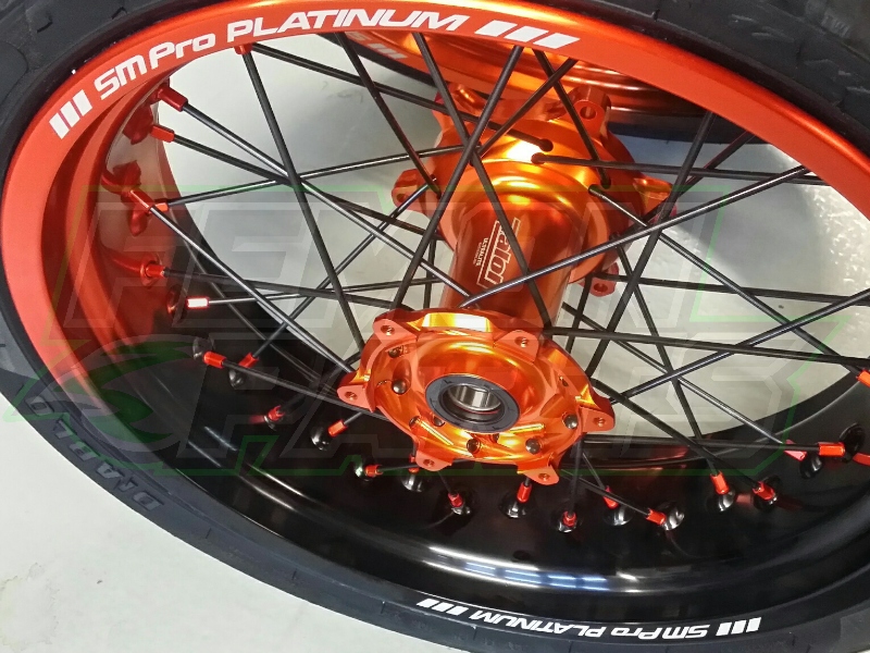 De standaard supermoto wielen zijn 17" hoog, met een breedte van 3,5" voor en 5" achter. Het voorwiel kan ook worden geleverd in 16,5" voor circuit gebruik (alleen in zwarte kleur). Het achterwiel kan ook worden geleverd met een breedte van 4,25".