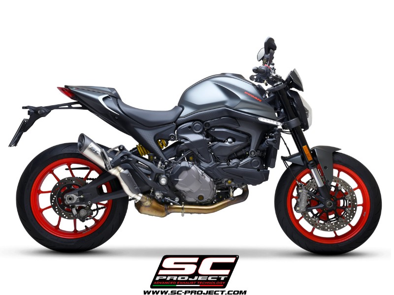 The S1 muffler represents for SC-Project the perfect combination of lightness and performance without compromise. Its conical shape with taut and essential lines make the S1 silencer fascinating giving outburst to your Ducati Monster 937. Born from the experience of the racing department on the circuits of the WSBK Championship, the silencer has a titanium body with carbon end cap with a special sound-absorbing material that resists high temperatures. To make it unique and unmistakable our technicians have used the best production processes: brackets and fittings welded with T.I.G. technology, the insert bushings in titanium made in CNC and lasered Logo. From the high and powerful sound the S1 silencer will make the sound of your moto unique.