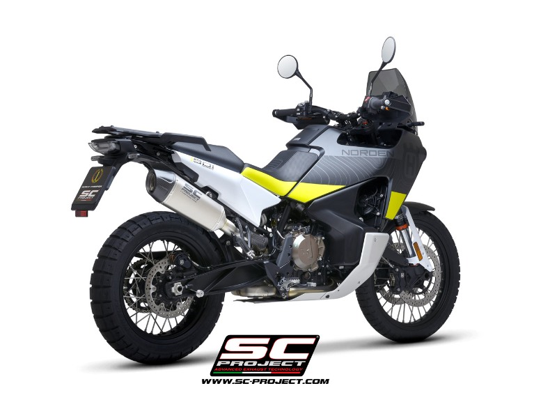 The X-Plorer II muffler is manufactured with high quality titanium and using all technical solutions tested all over the world during very long distance travels in the most several conditions, both on road and especially off road use. All the components in titanium and Aisi304 stainless steel are welded with TIG technology (in protected environment) and the internal bushings are CNC machined from solid block: excellent couplings, top quality materials and high technology production processes are necessary to offer the best durability, quality and performance. For the Husqvarna Norden 901, the X-Plorer II muffler allows to save weight (-0,8 Kg if compared to the OEM exhaust) and to get a maximum gain of + 1,5 hp and +1,5 Nm of torque @ 6500 rpm, together with a stable improvement of power and torque delivery in the low and mid range. Everything has been developed to offer a superbe sound experience, in full compliance with Euro-5 regulations. The X-Plorer II silencer can be installed in combination with SC-Project racing decat, provided as additional option. This racing pipe link allows to remove the original catalyst installed: in this case we suggest ECU remapping to get the maximum performance and to optimize the engine delivery. The installation of the racing pipe link, does not meet the Euro-5 homologation regulations.